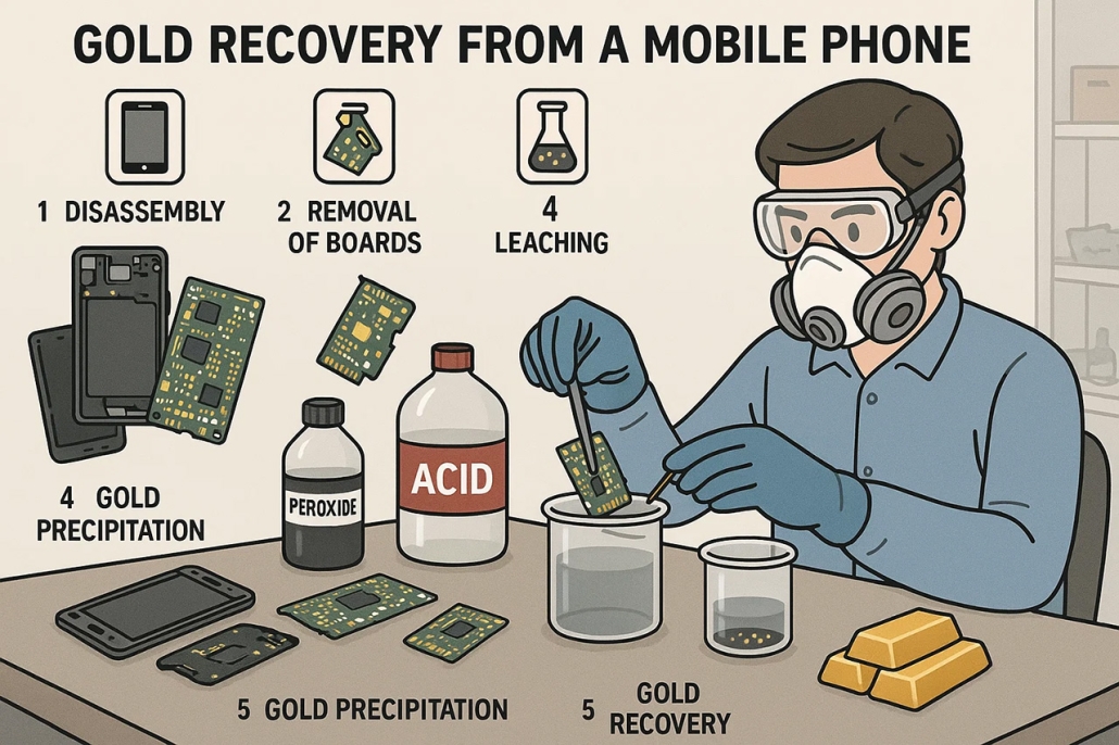 فلز طلا با خواص فیزیکی و شیمیایی منحصر به فردش، در ساختار بسیاری از تجهیزات الکترونیکی مدرن، به ویژه موبایل ها، کاربرد دارد. پس از پایان عمر مفید این وسایل، طلا همچنان به صورت خالص و بدون تغییر در برد باقی میماند و قابل بازیافت است. با استفاده از روش هایی مانند جداسازی با اسید نیتریک یا تیزآب سلطانی، میتوان به راحتی طلای موجود را استخراج کرده و آن را به منبعی برای درآمد تبدیل کرد.