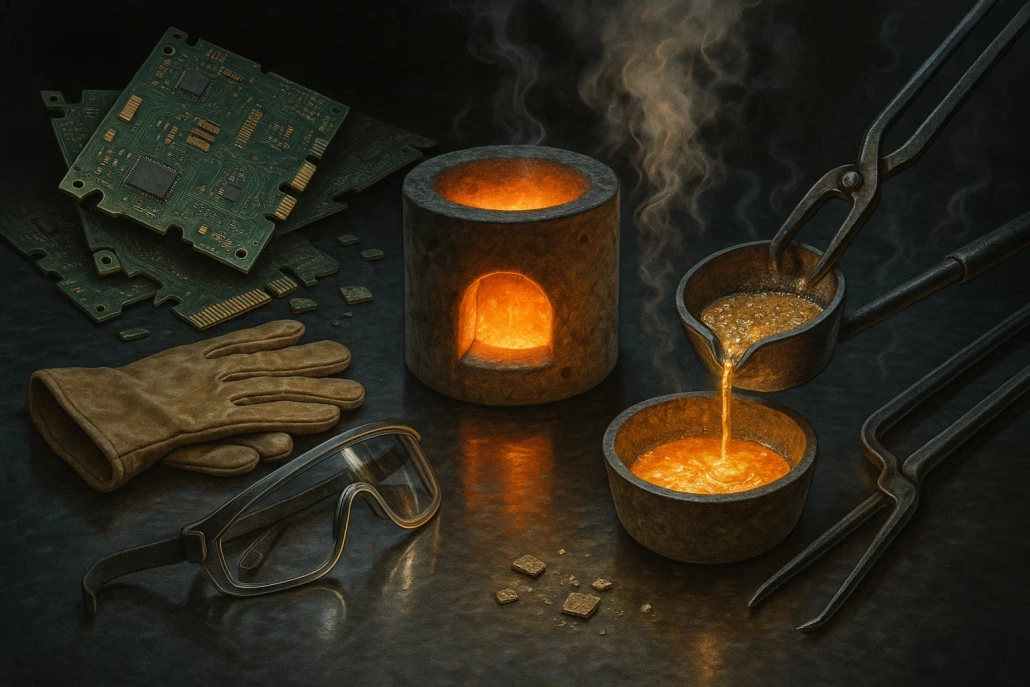 یکی از روش های رایج و پرکاربرد برای بازیابی طلا از قطعات الکترونیکی، فرآیند قالکاری یا به اصطلاح علمی تر پیرومتالورژی است. این روش عمدتاً در سطح صنعتی یا نیمهصنعتی اجرا میشود و توانایی بالایی در استخراج طلا از بردهای الکترونیکی و قطعات مختلف دارد. علاوه بر قطعات الکترونیکی، پیرومتالورژی قادر است طلا را از منابع متنوع دیگری نظیر خاکهای حاوی طلا، کاتالیستها، پسماندهای حاصل از طلاسازی و سایر مواد فلزی ارزشمند استخراج کند.