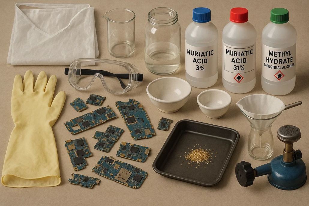 در صورتی که قصد انجام این فرایند را دارید، لازم است ابزارها و موادی خاص تهیه کنید. این مواد شامل قطعات الکترونیکی حاوی طلا، دستکش های ضخیم لاستیکی برای محافظت از دست، پیش بند مقاوم در برابر مواد شیمیایی، عینک ایمنی، پراکسید هیدروژن ۳ درصد (قابل تهیه از داروخانهها)، اسید موریاتیک ۳۱ درصد (قابل خرید از فروشگاه های شیمیایی)، متیل الکل یا متیل هیدرات ۹۹.۹ درصد (که در صنعت ضدیخ کاربرد دارد)، فیلتر قیفی و ظروف شیشه ای یا کاسه های سفالی مقاوم در برابر دمای بالا هستند.